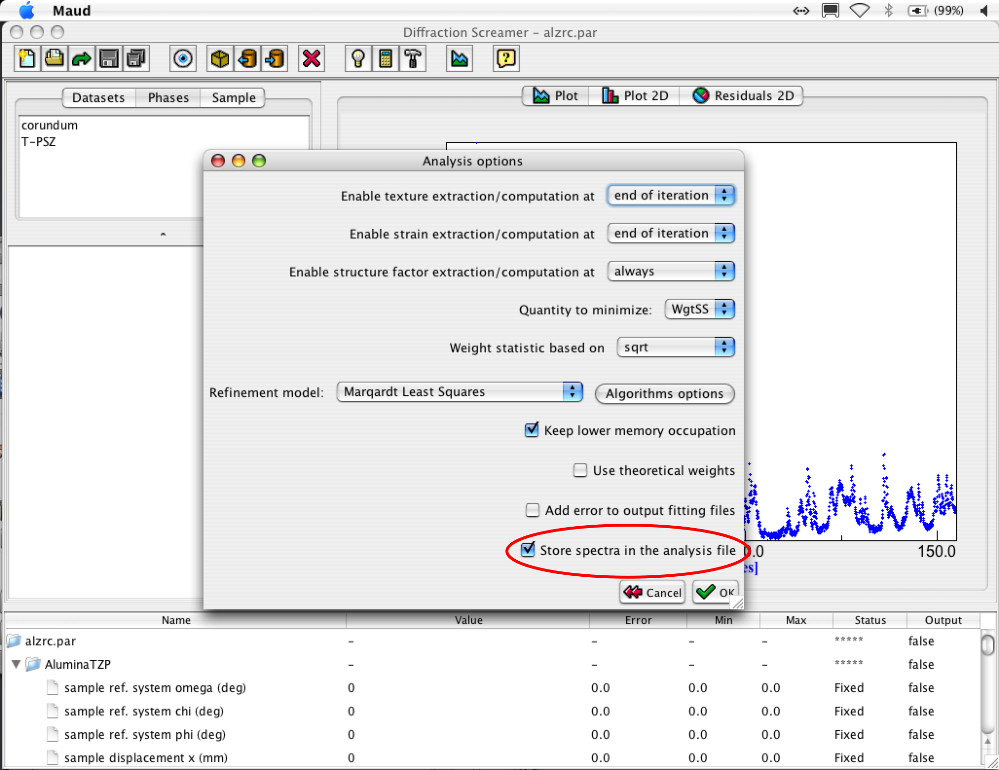 - TIP: from version 2.04x it is possible to store the spectrum data inside the analysis file, so you can save and move your analysis file without the need to carry or move around also the original data. To do this, click on the analysis menu bar and select options (this option will move to the preferences in the future). A window will appear like in the picture below. Check on the option store spectra in the analysis file (circled in red in the picture).